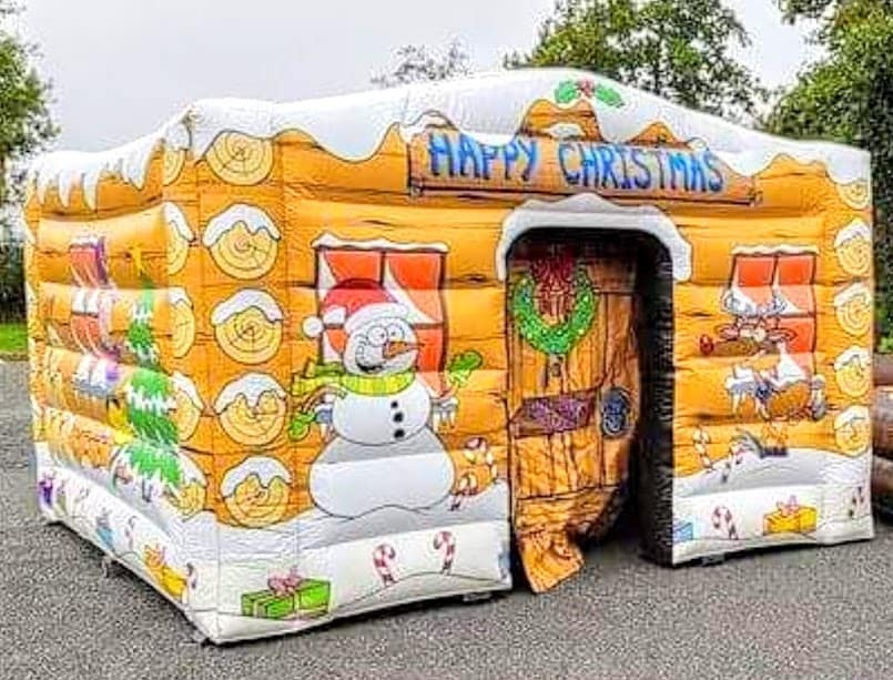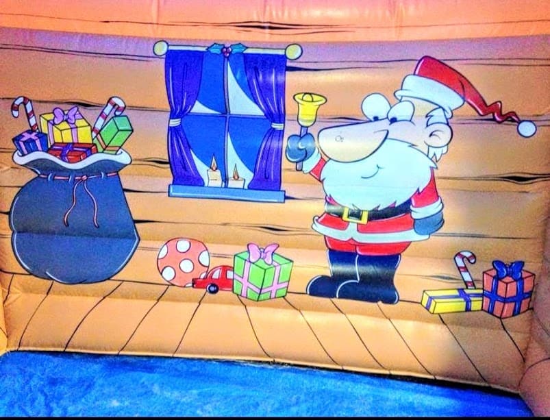 Santa's grotto is the latest inflatable grotto on the market; it is a white looking log cabin, with a lovely inflatable pitched roof, with hand painted woodwork effects on all 4 sides. It has icicles and hand painted on it. It has windows painted around it featuring the silhouette of Santa and a candy cane. The outsides of the cabin have Christmas trees, reindeer, snowmen, cheeky penguins and a lot lot more. The inside of the Santa's grotto for hire there is a hand painted open fireplace, a Christmas tree with presents and a big reading corned for Santa's chair. The Deluxe grotto has had over 70hrs of artwork and really does have to be seen to be believed. The inflatable Grotto works perfectly as a Christmas Themed Photo Booth Experience too!