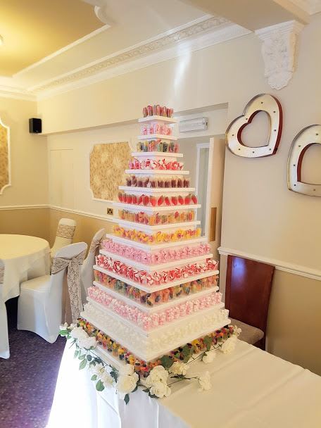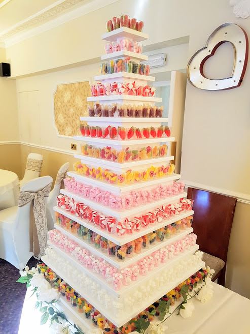 Our Sweet shot pyramid is incredibly popular for all type of events and occasions & has catered for events all over Wales. This particular item is very popular for weddings! It holds an impressive 450 plastic shot glasses full of different sweets on every tier. This is a visually impressive item to have in any room due to its height when placed on a table, yet easily reachable. It is a classy alternative to a sweet cart.