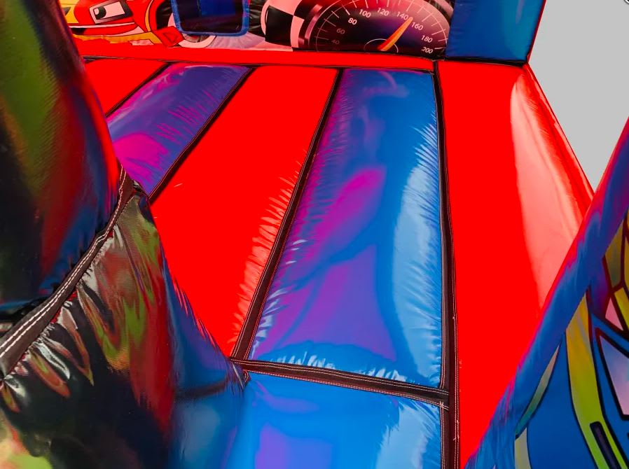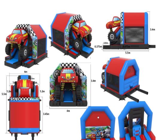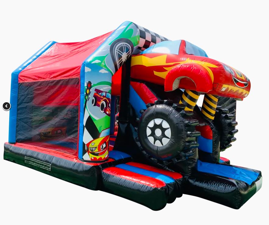 This Brand new Unit is an impressive 18ft Long x 13.5ft wide x 12.9ft high. (L/W/H). It is fully Enclosed with an internal sound system similar to our Super popular Disco Dome....but without the Height issue which sometimes is an issue with Smaller venues, which this castle will remedy!....Plus it has the added Fun of a Slide too! .With its Impressive Monster Truck themed artwork on both the Exterior and interior Walls, this will make any Monster truck lovers party a magical one!
