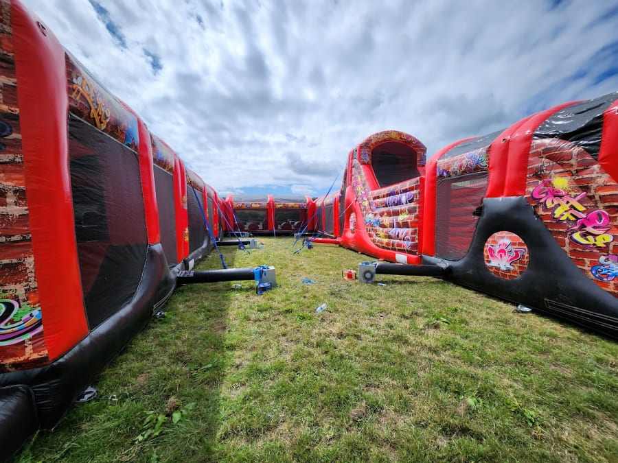 10 Part ADULT Build Your Own Giant Obstacle,6ft & 10ft slide - 200x11x15ft - with U-Bend (Red & Black Graffiti) - Assault Course hire in Pembrokeshire, Carmarthenshire, Swansea & Ceredigion.