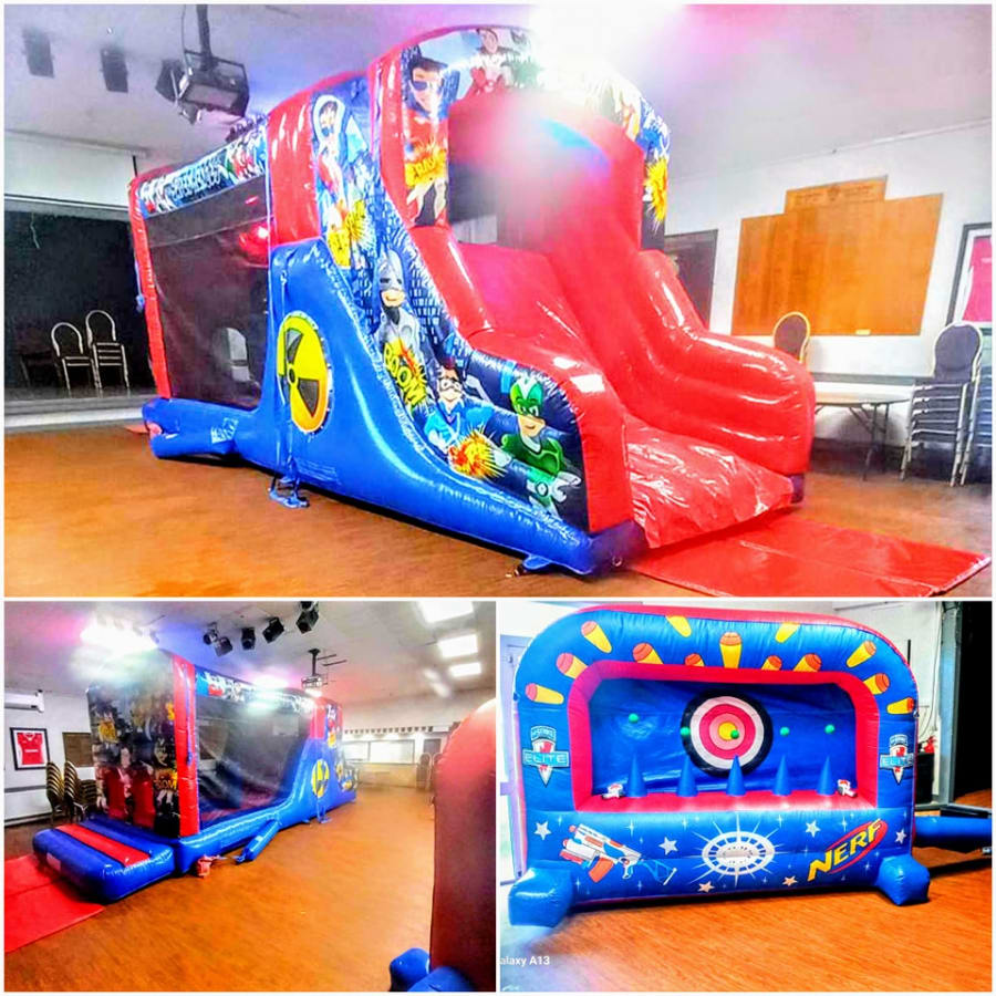 Transform your party into a thrilling superhero adventure with our Superhero Fun Run Package! The package includes a vibrant Superhero Fun Run Disco bouncy castle/slide combo, with either matching Superhero-themed soft play, and an exciting air juggler ball pit or Nerf Gun target wall. Get ready for endless entertainment as the little ones jump, slide, and play in this superhero-themed wonderland!