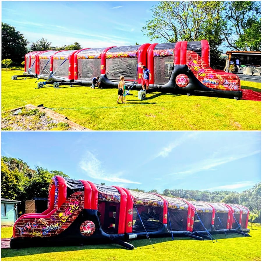 4 Part ADULT Build Your Own Giant Obstacle,6ft slide - 81x11x15ft - (Red & Black Graffiti) - Assault Course hire in Pembrokeshire, Carmarthenshire, Swansea & Ceredigion.