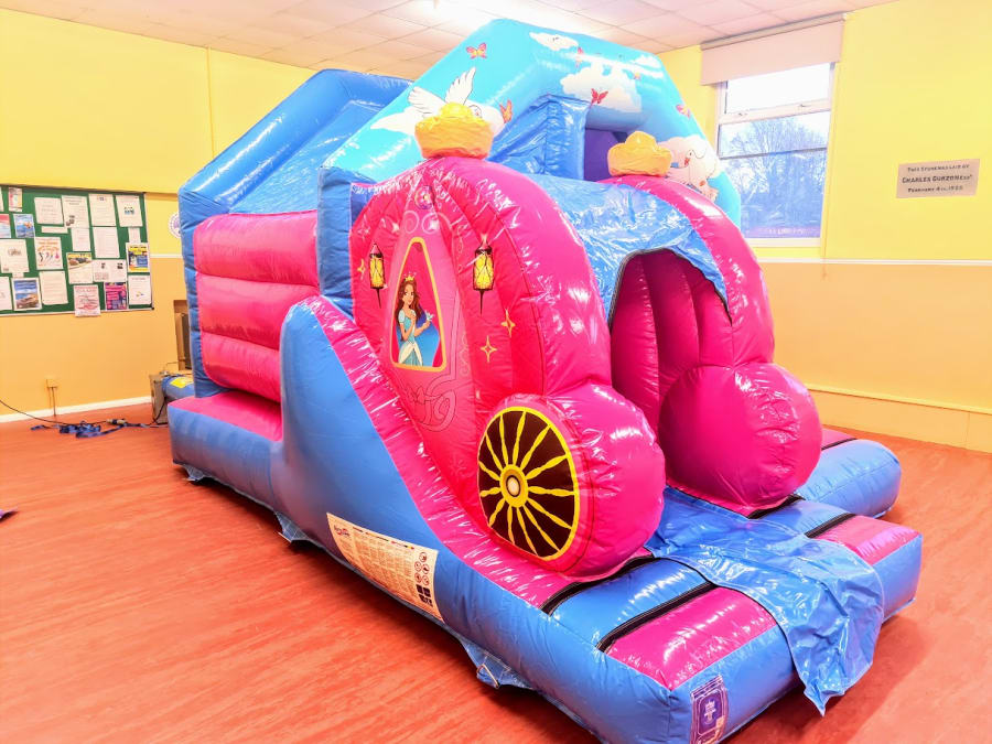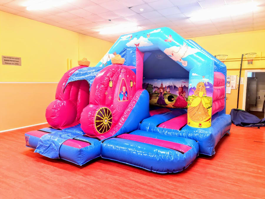 This Brand new Unit is an impressive 15.1ft Long x 12.1ft wide x 9.5ft high. (L/W/H). It is fully Enclosed with an internal lighting and sound system similar to our Super popular Disco Dome....but without the Height issue which sometimes is an issue with Smaller venues, which this castle will remedy!....Plus it has the added Fun of a Slide too! .With its Impressive Princess themed artwork this will make any Little princesses Party a magical one!