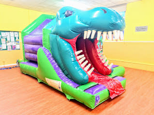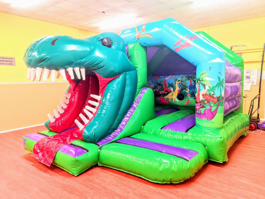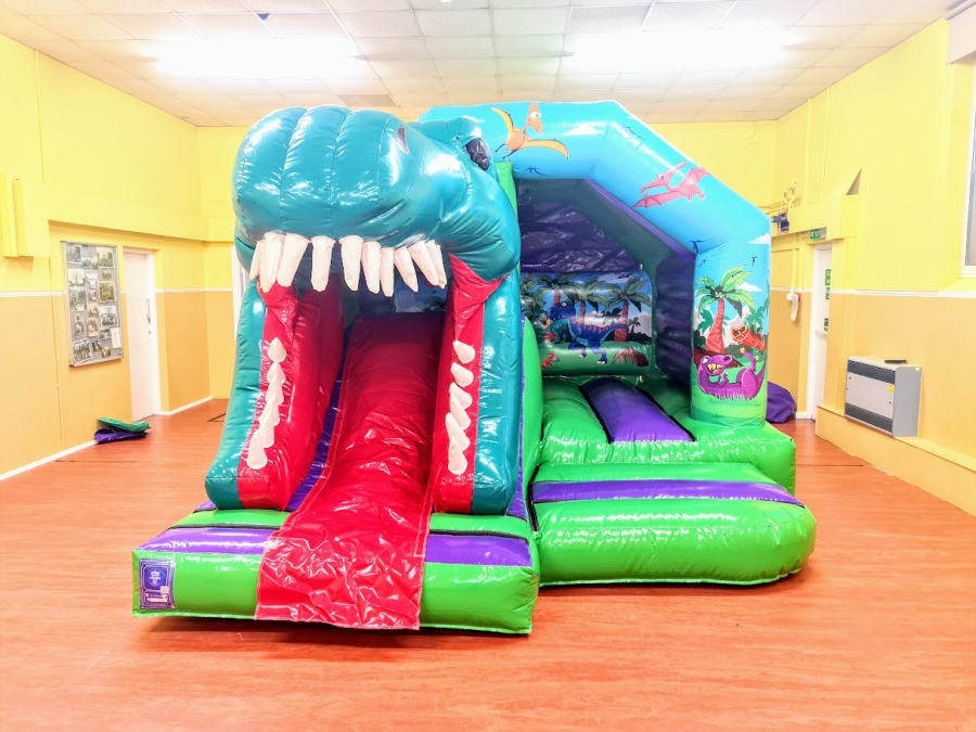 This Brand new Unit is an impressive 15.1ft Long x 12.1ft wide x 9.5ft high. (L/W/H). It is fully Enclosed with an internal lighting and sound system similar to our Super popular Disco Dome....but without the Height issue which sometimes is an issue with Smaller venues, which this castle will remedy!....Plus it has the added Fun of a Slide too! .With its Impressive dinosaur themed artwork this will make any Little ones Party a magical one!