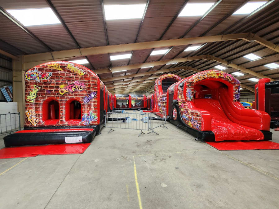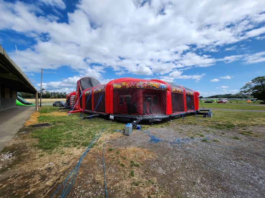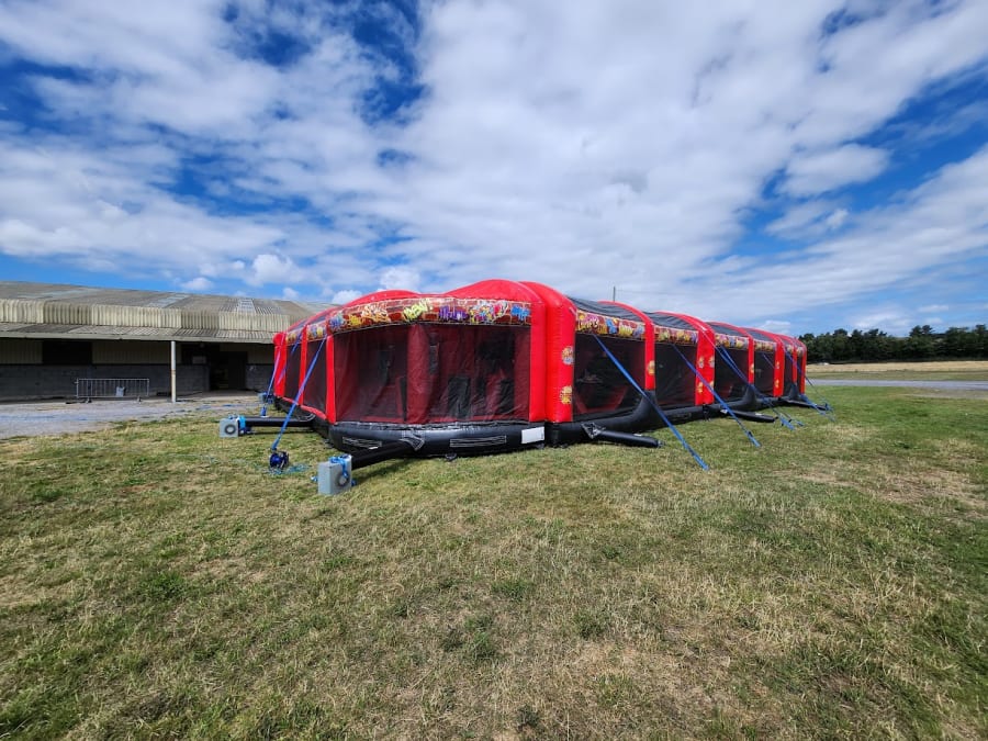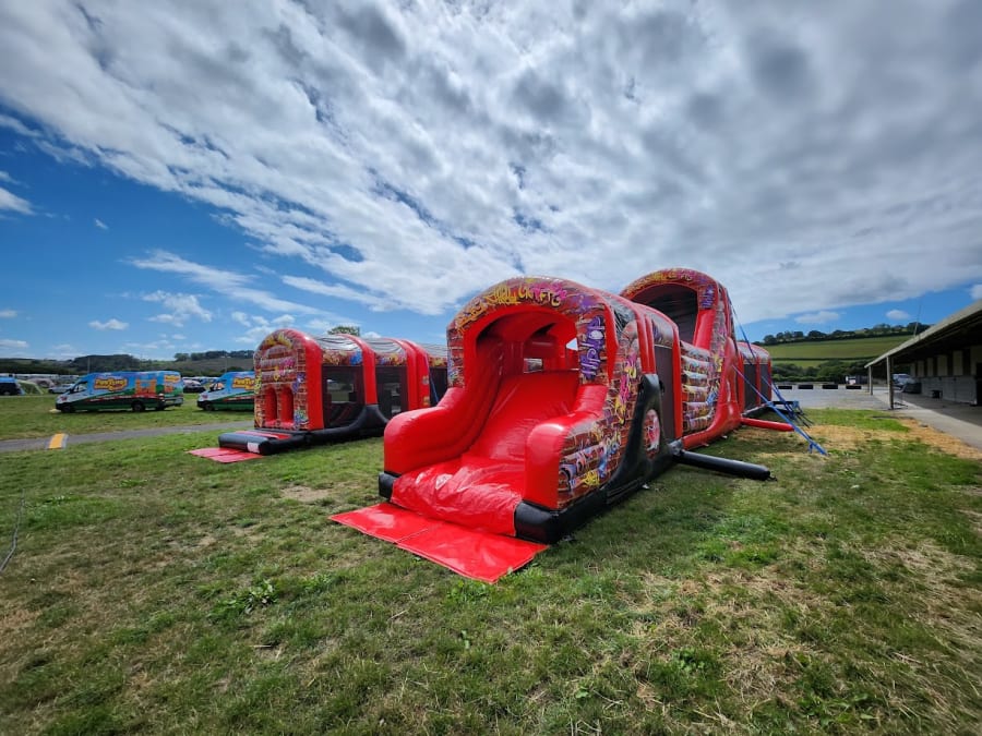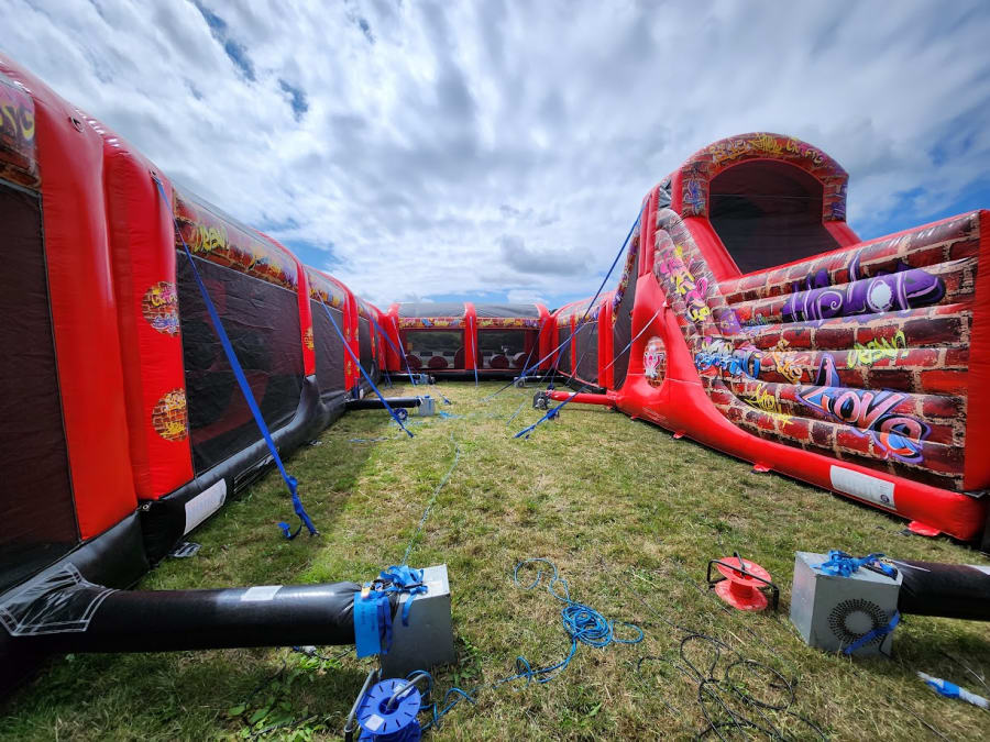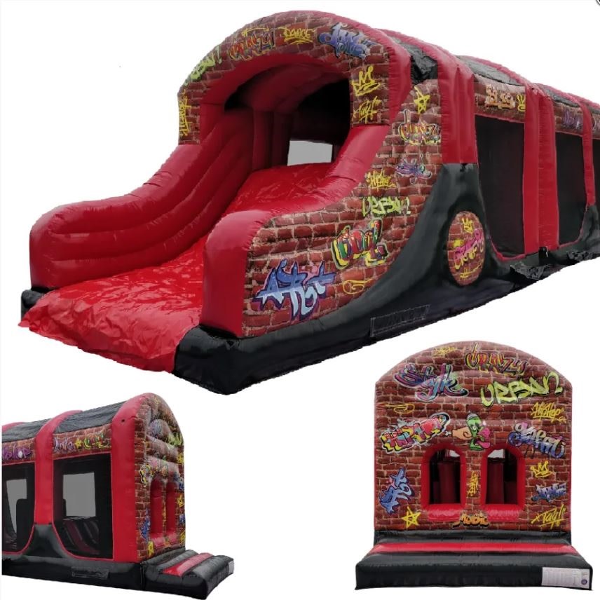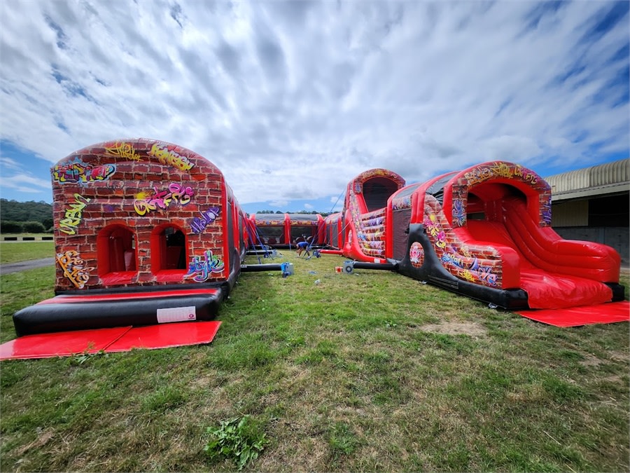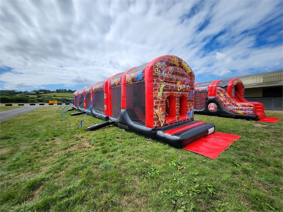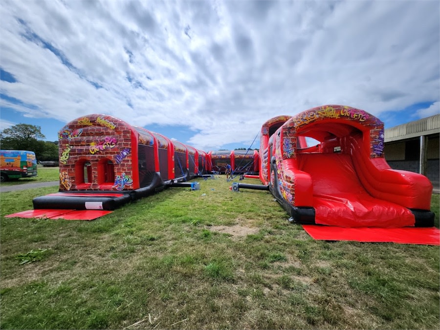 10 Part ADULT Build Your Own Giant Obstacle,6ft & 10ft slide - 200x11x15ft - with U-Bend (Red & Black Graffiti) - Assault Course hire in Pembrokeshire, Carmarthenshire, Swansea & Ceredigion.
