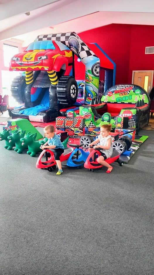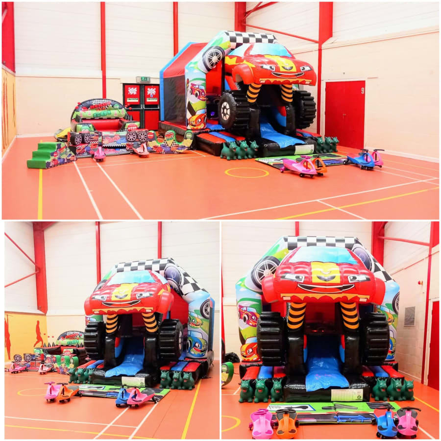 🚚 Monster Truck & Racecar bouncy castle/slide combo and matching themed soft play set for hours of entertainment.