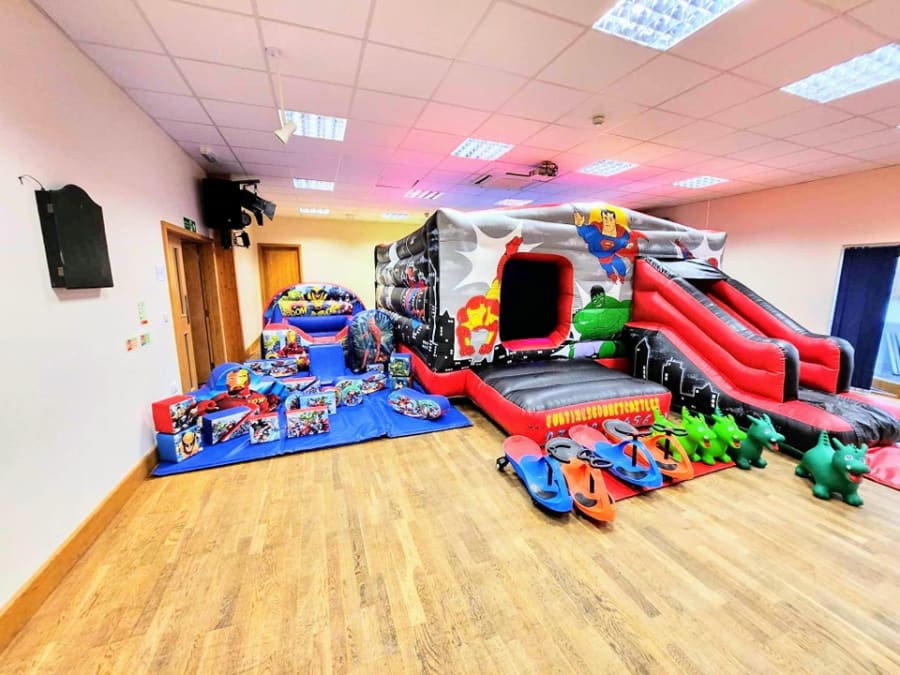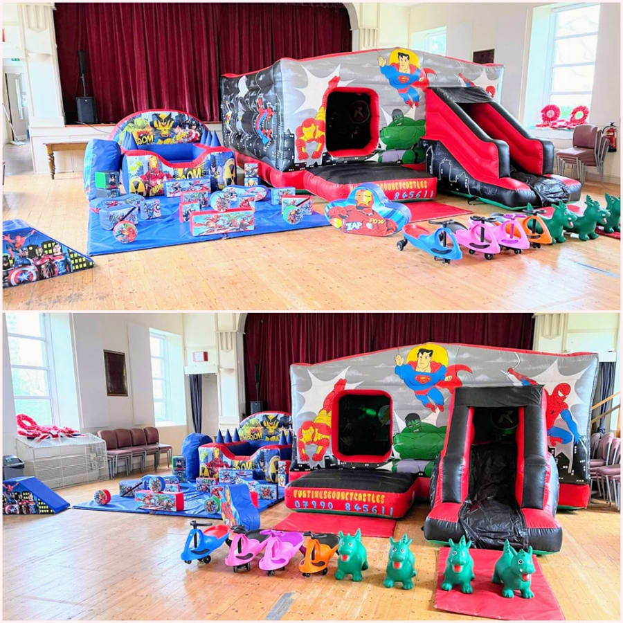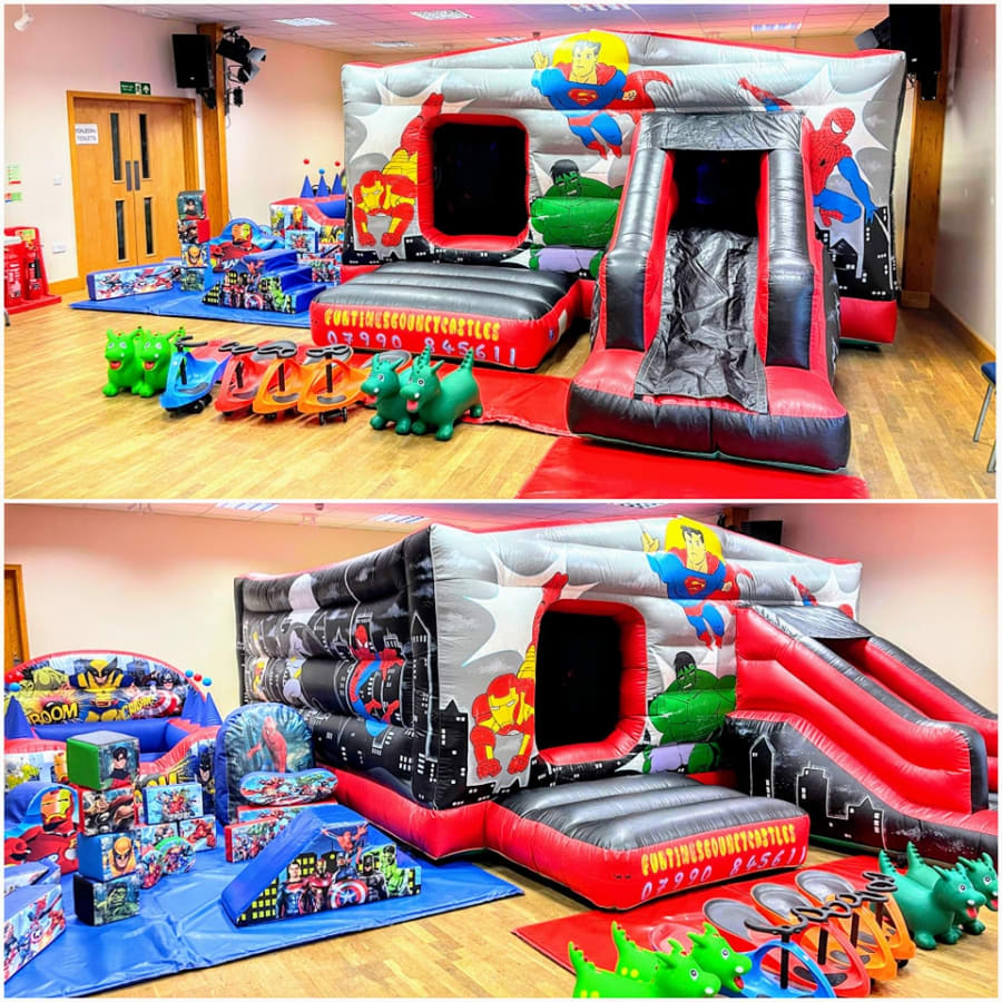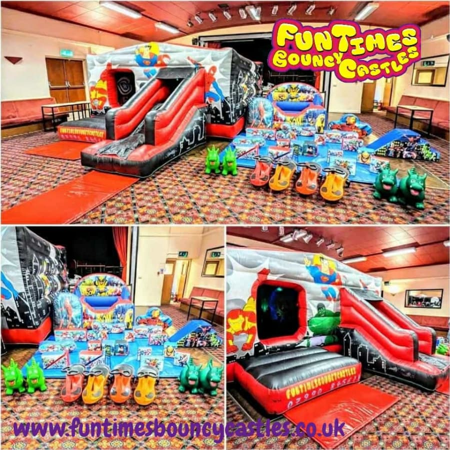 Transform your party into a thrilling superhero adventure with our Superhero Package! The package includes a vibrant Superhero Disco bouncy castle/slide combo, matching Superhero-themed soft play, and an exciting air juggler ball pit. Get ready for endless entertainment as the little ones jump, slide, and play in this superhero-themed wonderland!