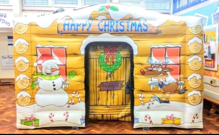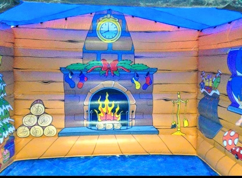 Santa's grotto is the latest inflatable grotto on the market; it is a white looking log cabin, with a lovely inflatable pitched roof, with hand painted woodwork effects on all 4 sides. It has icicles and hand painted on it. It has windows painted around it featuring the silhouette of Santa and a candy cane. The outsides of the cabin have Christmas trees, reindeer, snowmen, cheeky penguins and a lot lot more. The inside of the Santa's grotto for hire there is a hand painted open fireplace, a Christmas tree with presents and a big reading corned for Santa's chair. The Deluxe grotto has had over 70hrs of artwork and really does have to be seen to be believed. The inflatable Grotto works perfectly as a Christmas Themed Photo Booth Experience too!