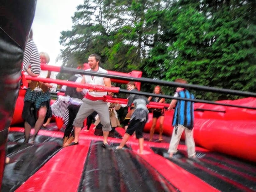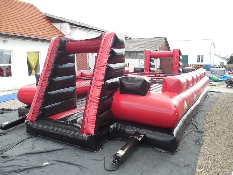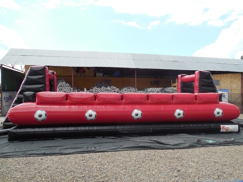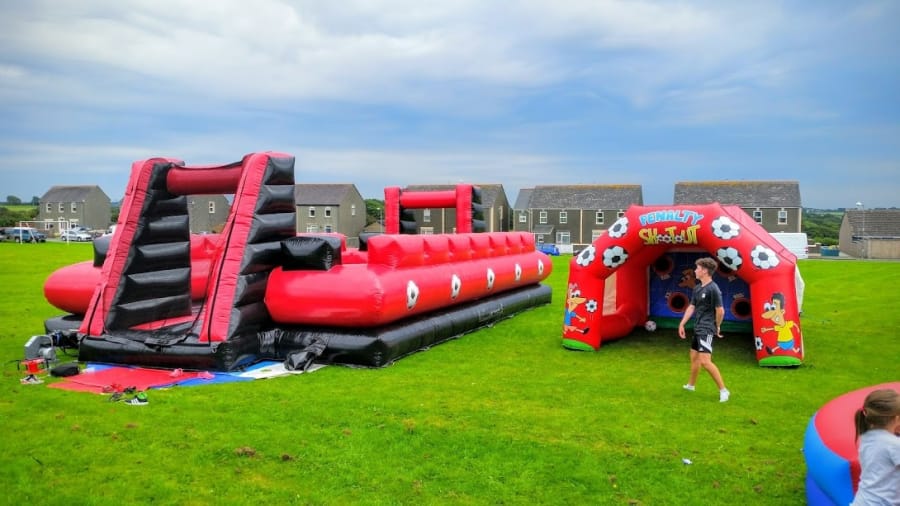 Our Inflatable Football Pitch is an incredibly eye catching Inflatable. It is a Brand New addition which we are sure will be incredibly popular for all type of large scale events and occasions all over Wales. Due to its impressive size This particular inflatable is built for Adult use as well as children. It is also perfect for Team Building, Sports Events, Corporate events, fairs & fetes! Our Inflatable Football Pitch is perfect If it is a competitive physical challenge you are looking for. It is capable of having up to 12 competitors at once play, perfect for a Six aside Match!....If you throw a a little Water and Fairy Liquid on it also Becomes the Super Funny 'Soapy Soccer Game' Our inflatable Football Pitch is an impressive size and has a real wow factor when seen due to its tall arches over it! At 53T x 26FT (Allow extra 5ft for blower tube), it is a very large unit so if you are wondering whether you have the room for it, please feel free to contact us on 07990845611 or message us through our contacts page.
