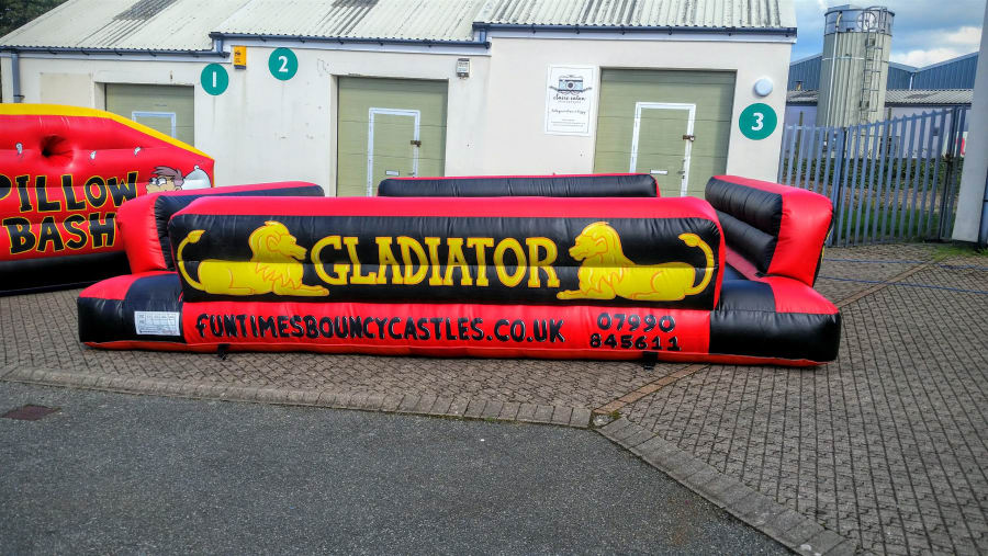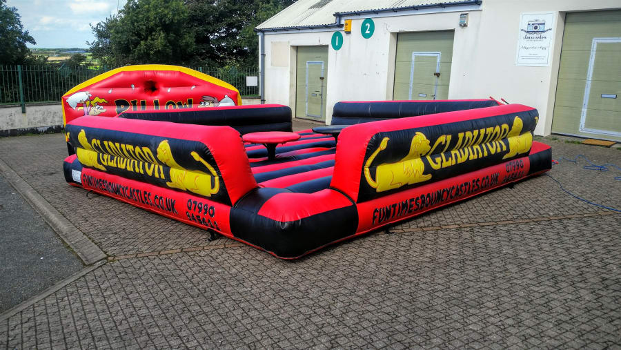 Our Gladiator Duel Inflatable is an incredibly eye catching Inflatable. It is incredibly popular for all type of large scale events and occasions & has catered for events all over Wales. This particular castle is very popular for Adult parties. It is also perfect for Corporate events, fairs & fetes! Due to its impressive Size is capable of both adult & children's use! Our Gladiator Duel Inflatable is perfect If it is a competitive physical challenge you are looking for. Each of the two contestants has a pedestal that they stand on, and a pugil stick and protective headgear. The idea is to knock your opponent off there pedestal to be the winner. At 18FT x 18FT (Allow extra 5ft for blower tube), it is a very large unit so if you are wondering whether you have the room for it, please feel free to contact us on 07990845611 or message us through our contacts page.