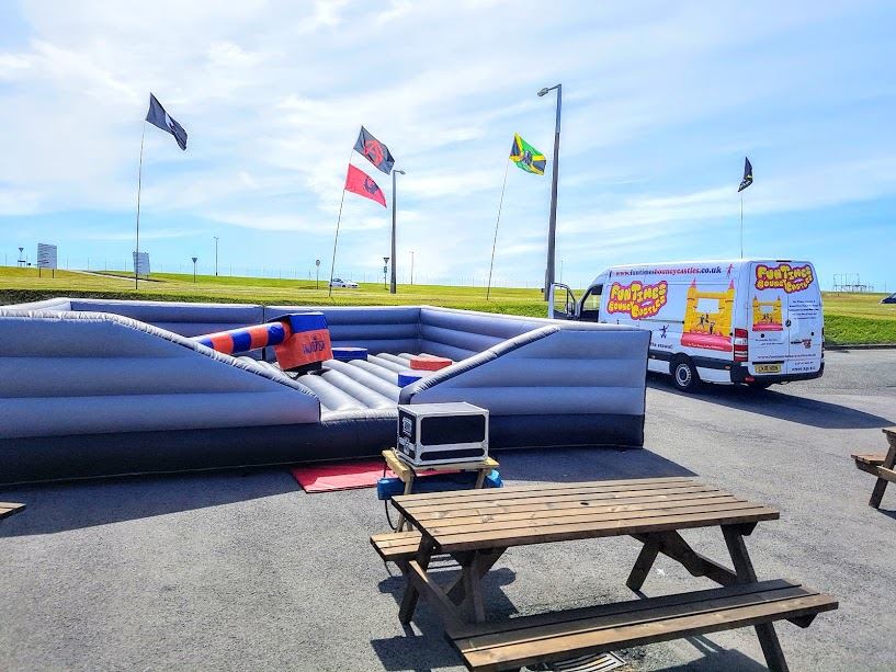 The Fun Times Wipeout is unique as it is the Only one of its kind which can pivot as well as rotate has variable speed for the beginner or advanced user. The Wipeout is always hired with an operator and is fully supervised for the whole duration of the event. We provide Up to 10 million public liability insurance on the Bull and can provide a copy of insurance if required by the venue. We also complete a detailed Risk assessment on site.