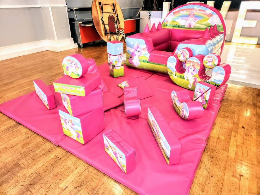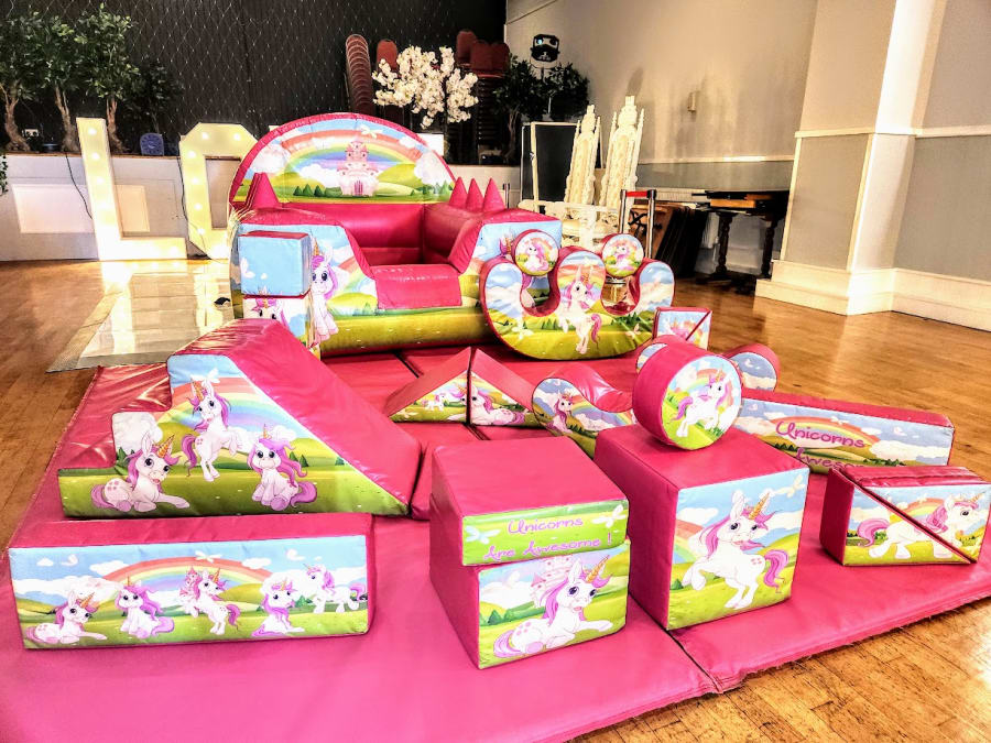 Our 24 piece Unicorn theme soft play set is the an incredibly colorful & eye catching. This perfect choice for your little one party! It has 24 pieces of different shapes and sizes including a soft play sea sore and slide + Unicorn Stable & Unicorn Car!